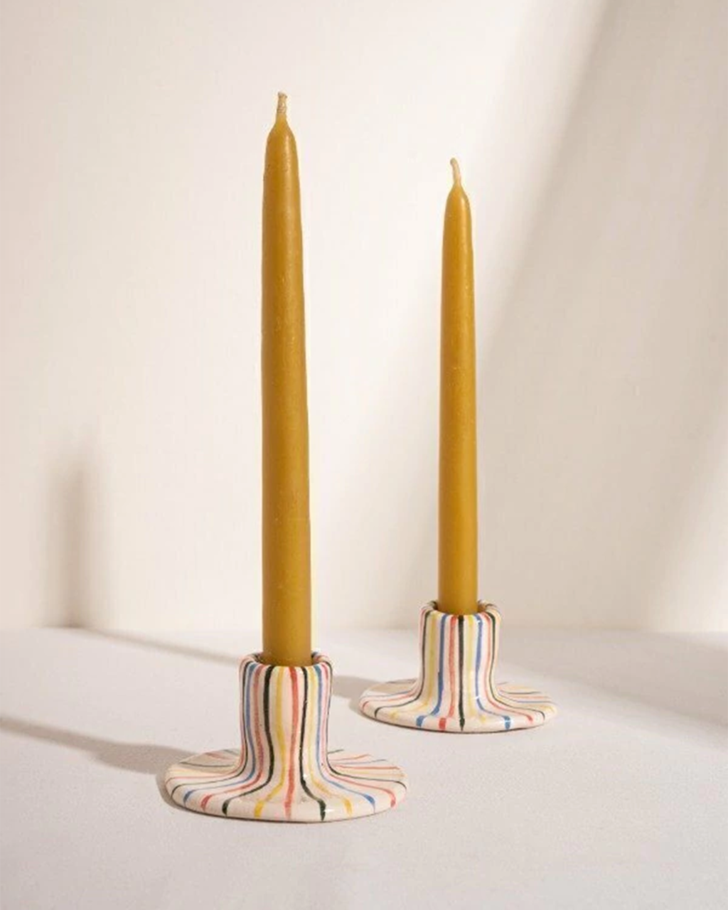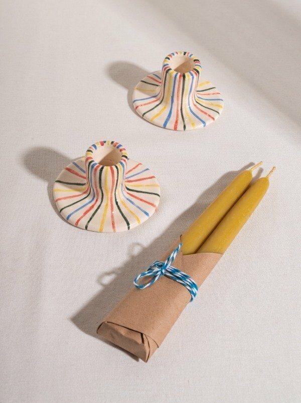 Par de candelabros de cerámica multicolor modelados y pintados a mano, incluye un par de velas de cera de abeja elaboradas artesanalmente.